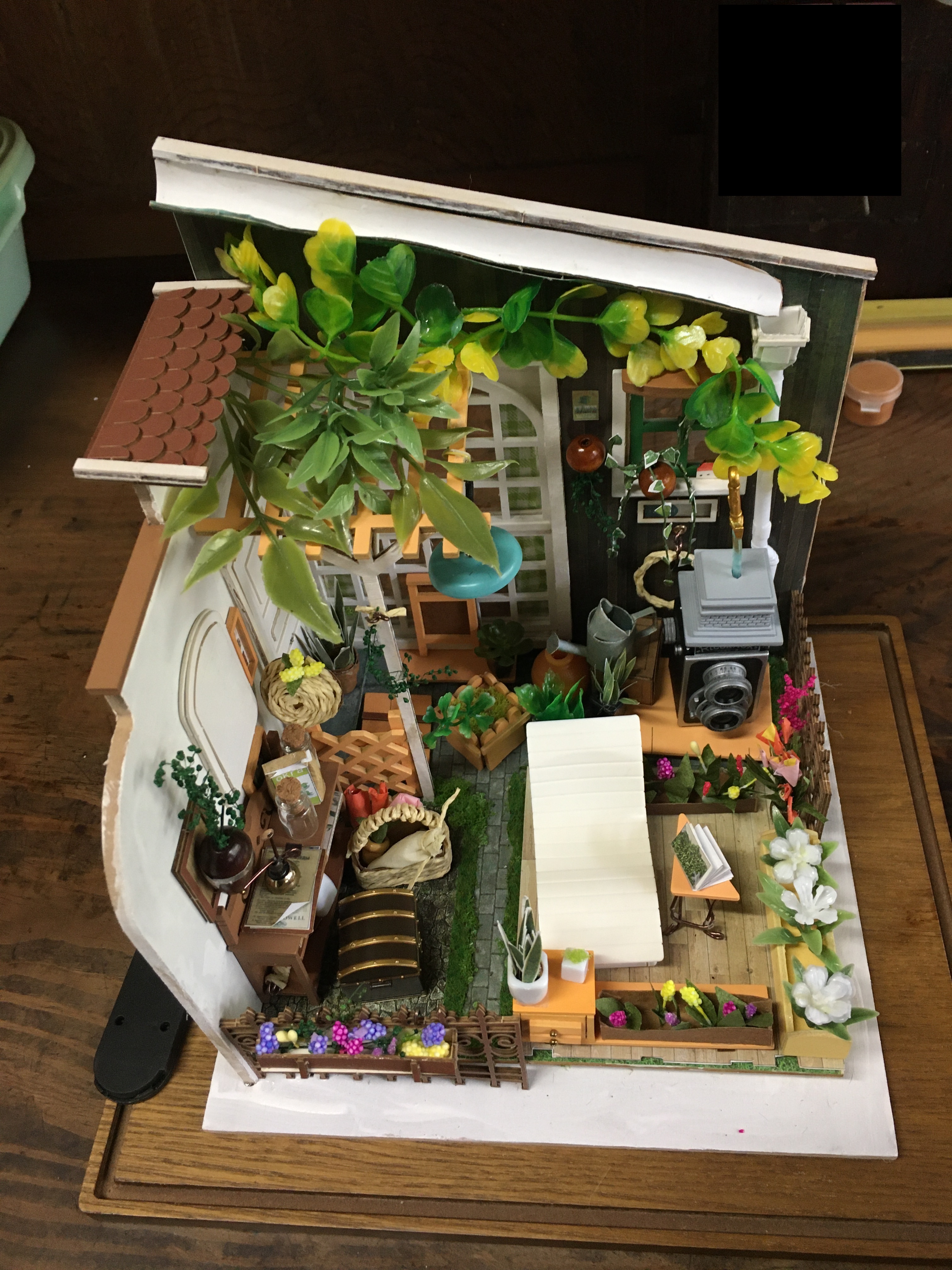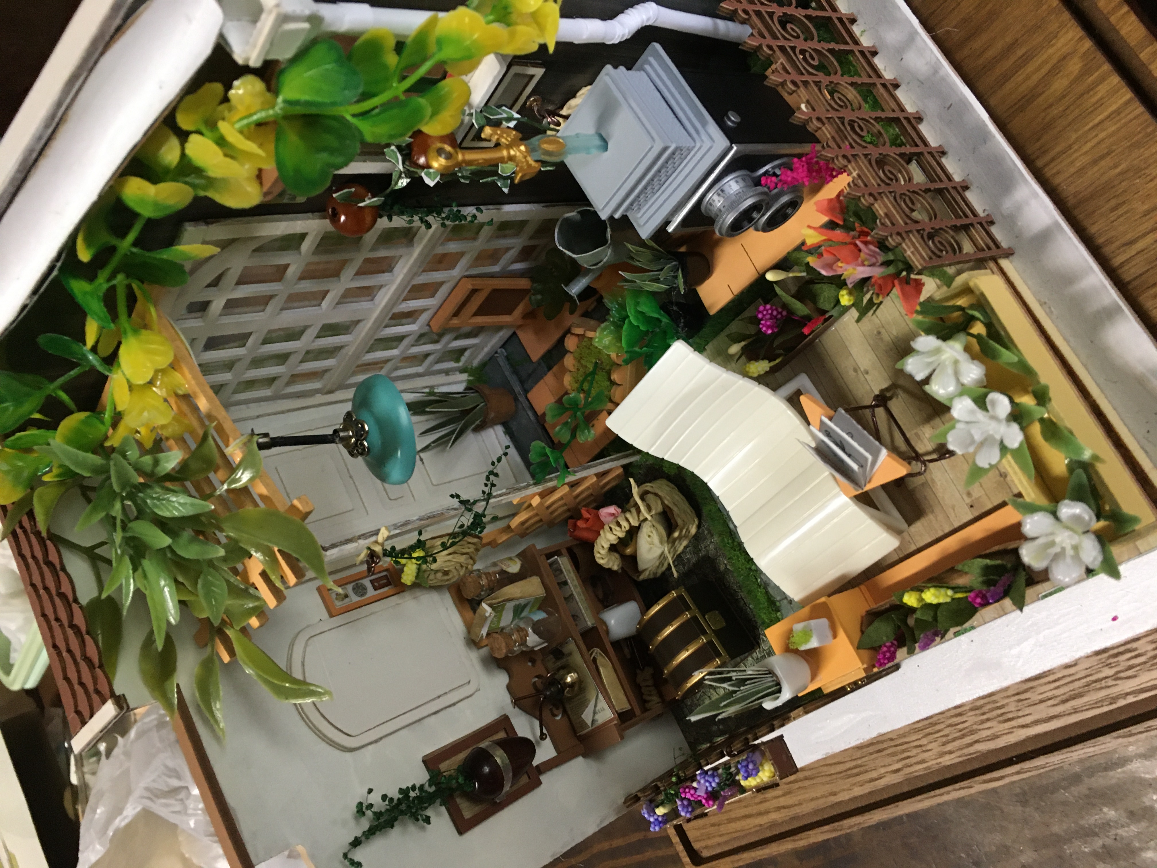 部屋の中に咲き乱れる花。壁はツタでおおわれている。いたるところに植物が生い茂っている。